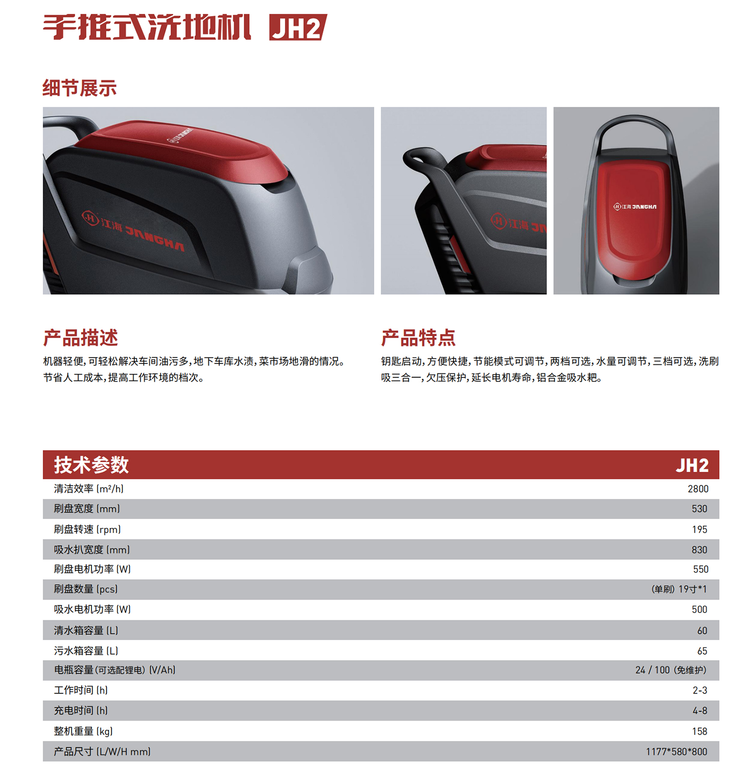 鑰匙啟動,方便快捷,節(jié)能模式可調(diào)節(jié),兩檔可選,水量可調(diào)節(jié),三檔可選,洗刷吸三合一,欠壓保護,延長電機壽命,鋁合金吸水耙。