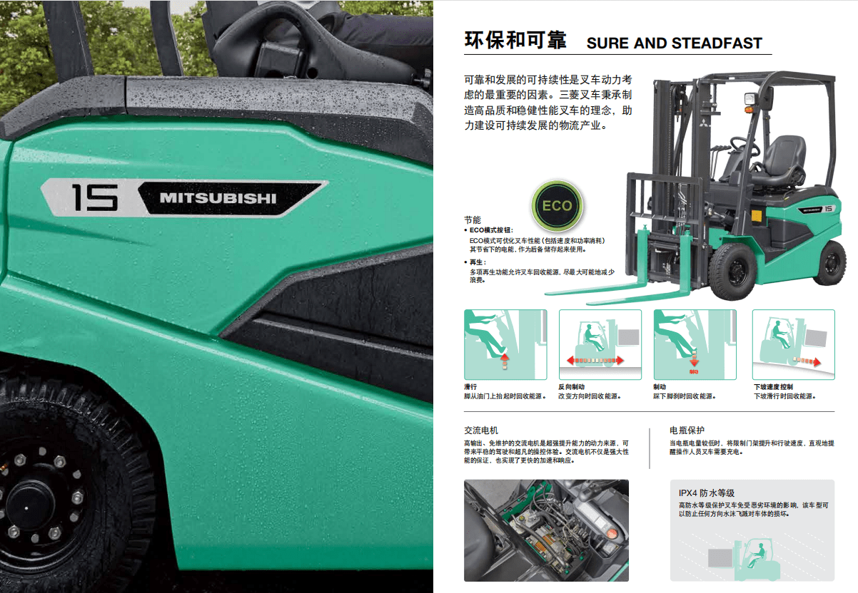 可靠和發展的可持續性是叉車動力考慮的最重要的因素。三菱叉車秉承制造高品質和穩健性能叉車的理念,助力建設可持續發展的物流產業。節能●ECO模式按鈕∶ECO模式可優化叉車性能(包括速度和功率消耗)其節省下的電能,作為后備儲存起來使用。●再生∶多項再生...